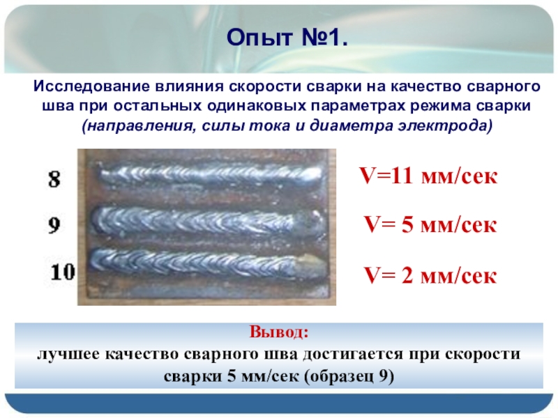 Исследование влияния скорости сварки на качество сварного шва при остальных одинаковых параметрах режима сварки (направления, силы тока и диаметра электрода)