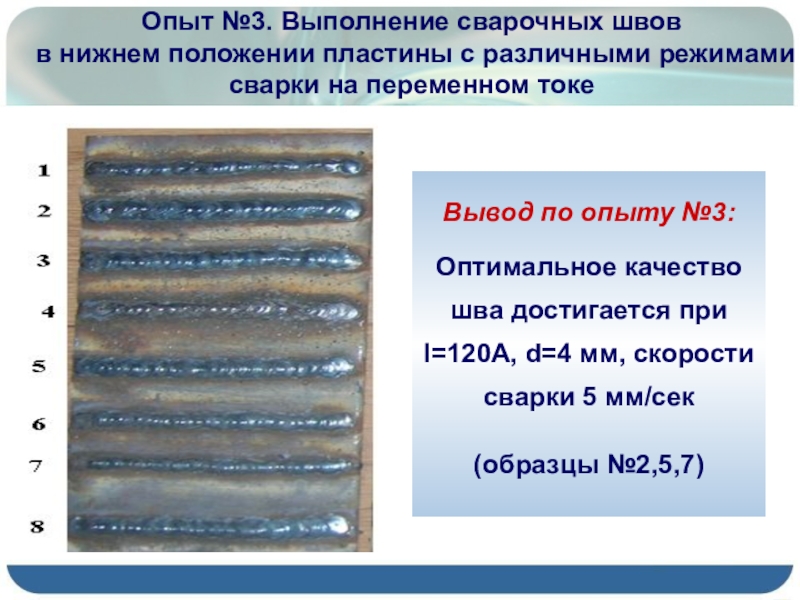 в нижнем положении пластины с различными режимами сварки на переменном токе
