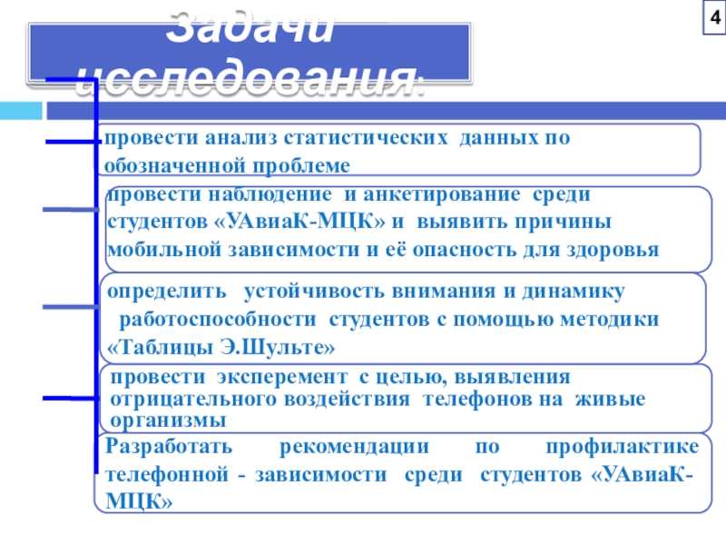 провести наблюдение и анкетирование среди студентов «УАвиаК-МЦК» и выявить причины мобильной зависимости и её опасность для здоровья