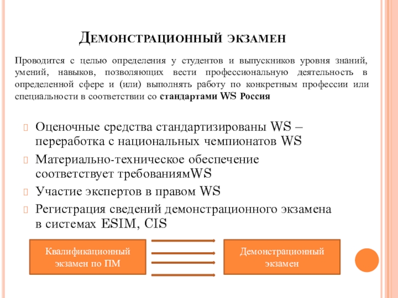 Проводится с целью определения у студентов и выпускников уровня знаний, умений, навыков, позволяющих вести профессиональную деятельность в определенной сфере и (или) выполнять работу по конкретным профессии или специальности в соответствии со стандартами WS Россия