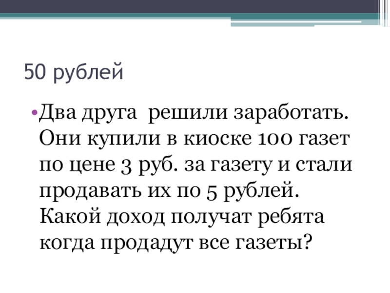 по цене 3 руб. за газету и стали продавать их по 5 рублей. Какой доход получат ребята когда продадут все газеты?