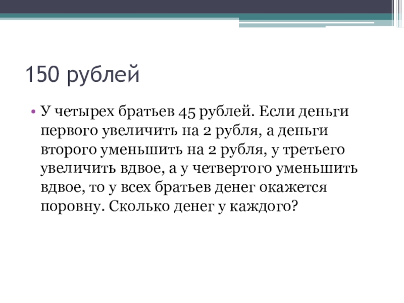 У четырех братьев 45 рублей. Если деньги первого увеличить на