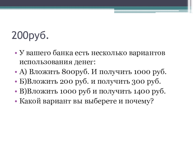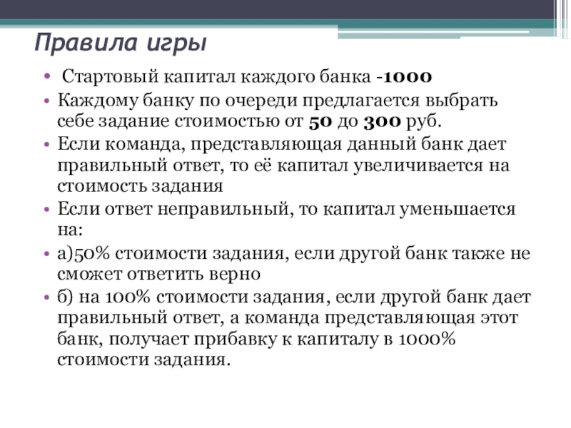 б) на 100% стоимости задания, если другой банк дает правильный ответ, а команда представляющая этот банк, получает прибавку к капиталу в 1000% стоимости задания.