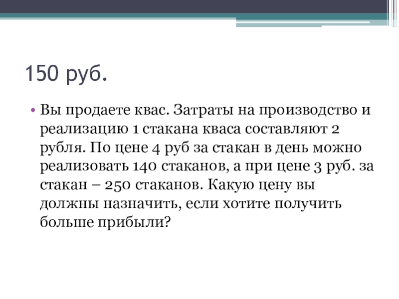 кваса составляют 2 рубля. По цене 4 руб за стакан в день можно реализовать 140 стаканов, а при цене 3 руб. за стакан – 250 стаканов. Какую цену вы должны назначить, если хотите получить больше прибыли?