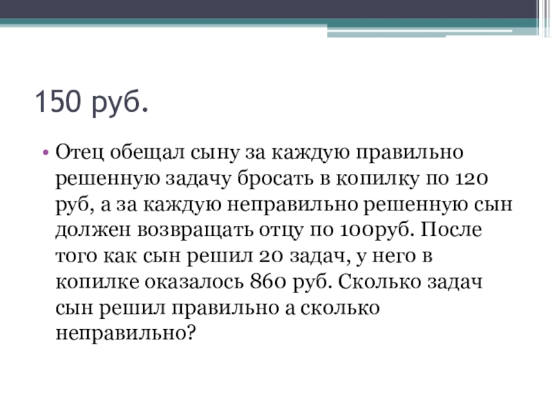 копилку по 120 руб, а за каждую неправильно решенную сын должен возвращать отцу по 100руб. После того как сын решил 20 задач, у него в копилке оказалось 860 руб. Сколько задач сын решил правильно а сколько неправильно?