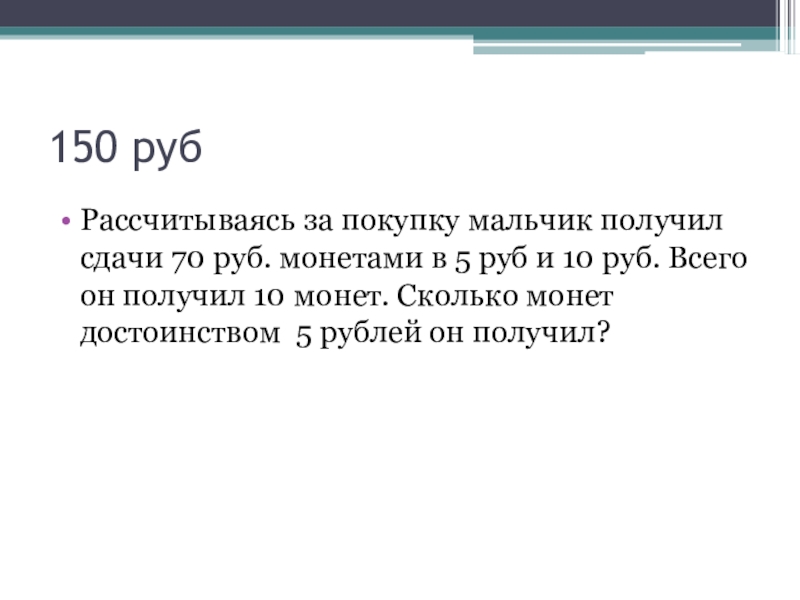 Рассчитываясь за покупку мальчик получил сдачи 70 руб. монетами в