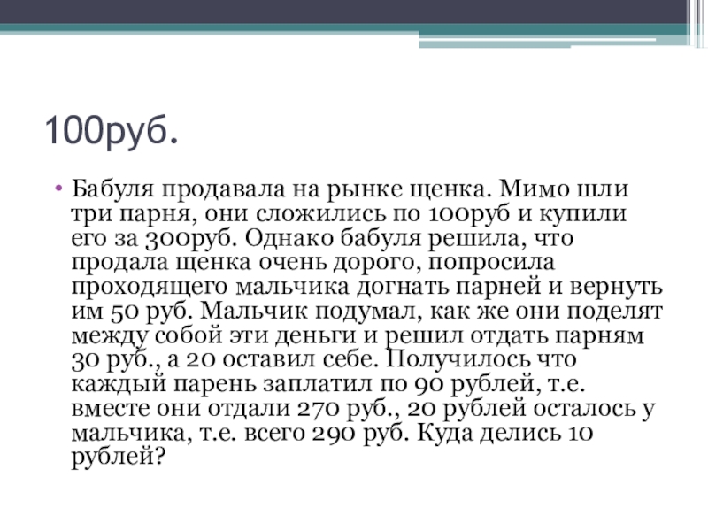 по 100руб и купили его за 300руб. Однако бабуля решила, что продала щенка очень дорого, попросила проходящего мальчика догнать парней и вернуть им 50 руб. Мальчик подумал, как же они поделят между собой эти деньги и решил отдать парням 30 руб., а 20 оставил себе. Получилось что каждый парень заплатил по 90 рублей, т.е. вместе они отдали 270 руб., 20 рублей осталось у мальчика, т.е. всего 290 руб. Куда делись 10 рублей?