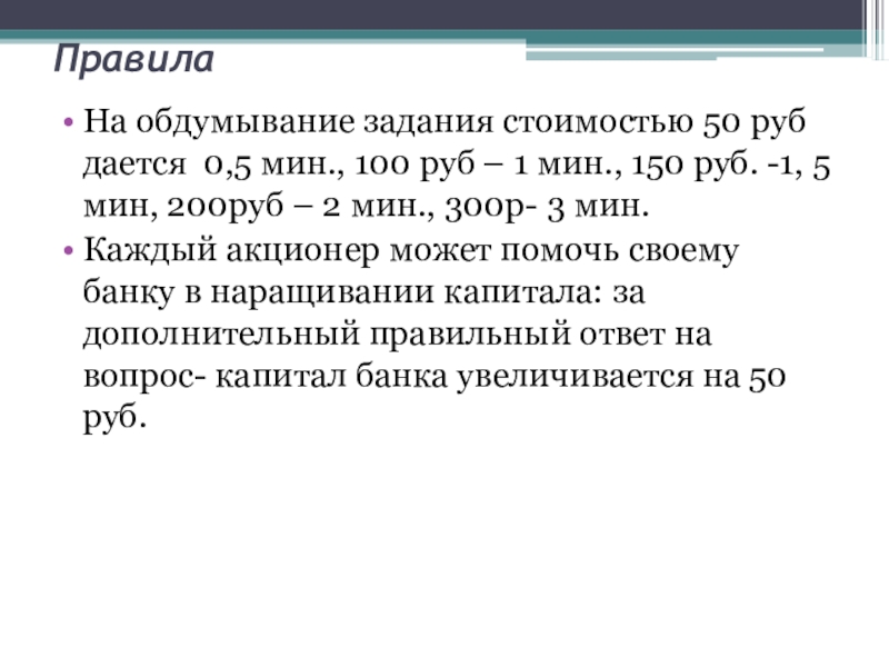 Каждый акционер может помочь своему банку в наращивании капитала: за дополнительный правильный ответ на вопрос- капитал банка увеличивается на 50 руб.