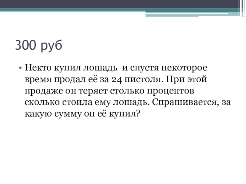 24 пистоля. При этой продаже он теряет столько процентов сколько стоила ему лошадь. Спрашивается, за какую сумму он её купил?