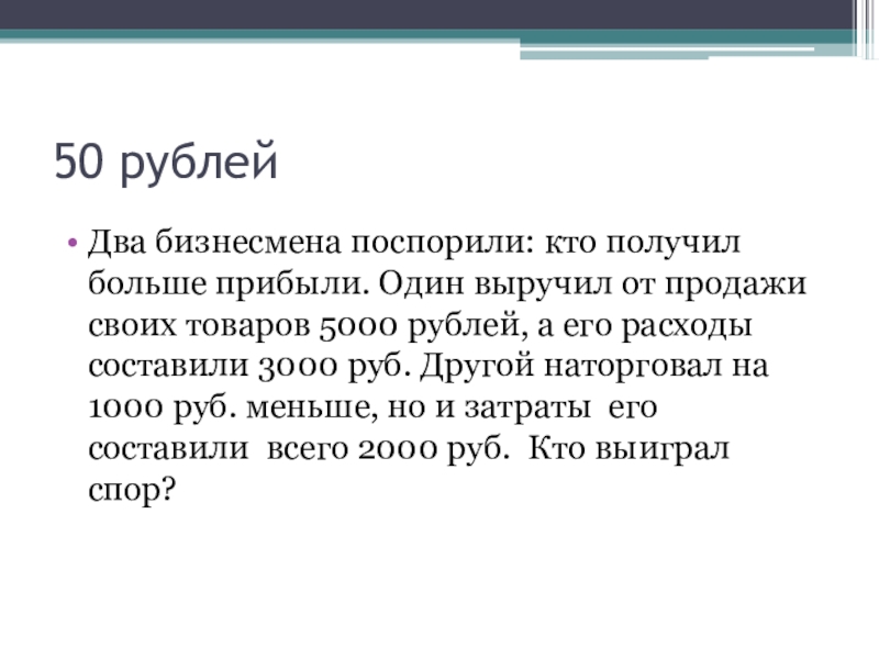 продажи своих товаров 5000 рублей, а его расходы составили 3000 руб. Другой наторговал на 1000 руб. меньше, но и затраты его составили всего 2000 руб. Кто выиграл спор?