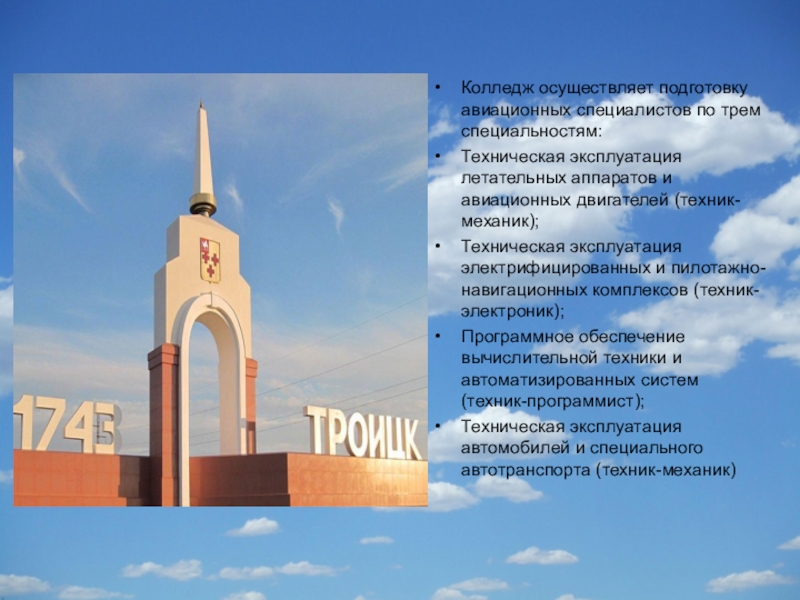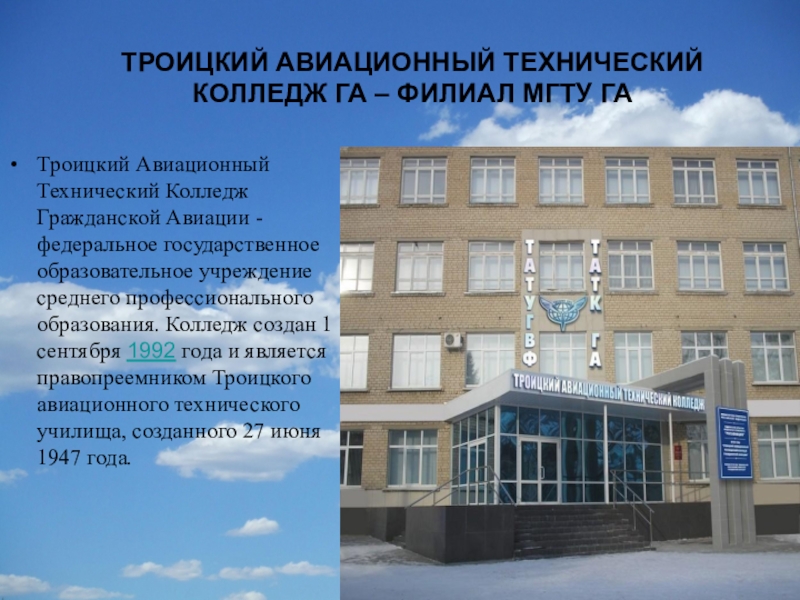 Слайд 2ТРОИЦКИЙ АВИАЦИОННЫЙ ТЕХНИЧЕСКИЙ КОЛЛЕДЖ ГА – ФИЛИАЛ МГТУ ГА