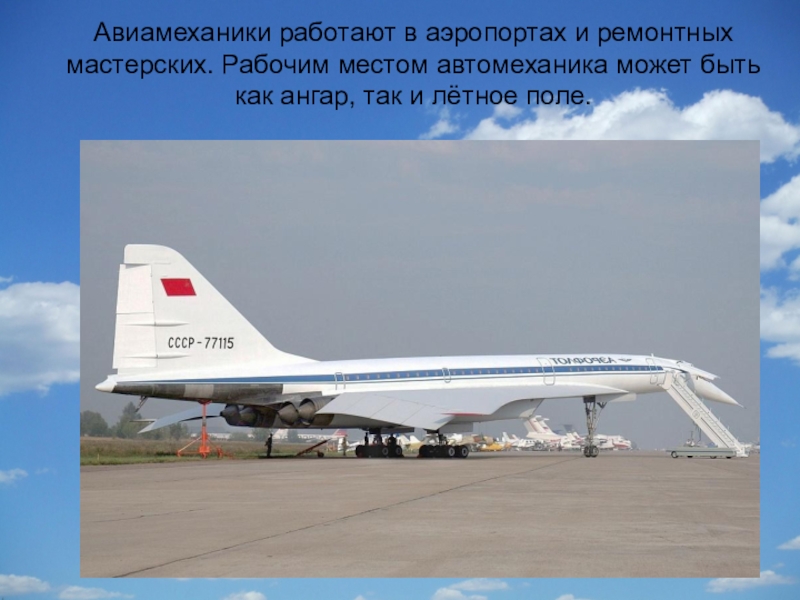 Слайд 16Авиамеханики работают в аэропортах и ремонтных мастерских. Рабочим местом автомеханика может