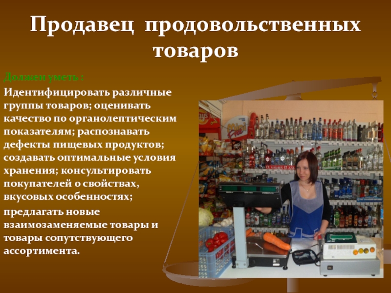 по органолептическим показателям; распознавать дефекты пищевых продуктов; создавать оптимальные условия хранения; консультировать покупателей о свойствах, вкусовых особенностях;