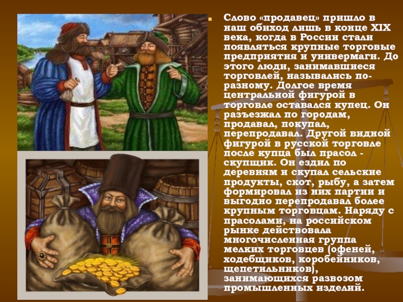 когда в России стали появляться крупные торговые предприятия и универмаги. До этого люди, занимавшиеся торговлей, назывались по-разному. Долгое время центральной фигурой в торговле оставался купец. Он разъезжал по городам, продавал, покупал, перепродавал. Другой видной фигурой в русской торговле после купца был прасол - скупщик. Он ездил по деревням и скупал сельские продукты, скот, рыбу, а затем формировал из них партии и выгодно перепродавал более крупным торговцам. Наряду с прасолами, на российском рынке действовала многочисленная группа мелких торговцев (офеней, ходебщиков, коробейников, щепетильников), занимающихся развозом промышленных изделий.