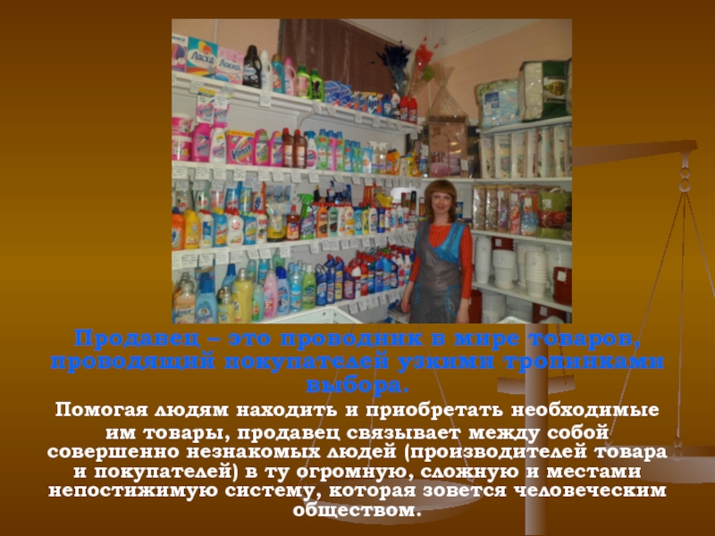 Слайд 9Продавец – это проводник в мире товаров, проводящий покупателей узкими тропинками