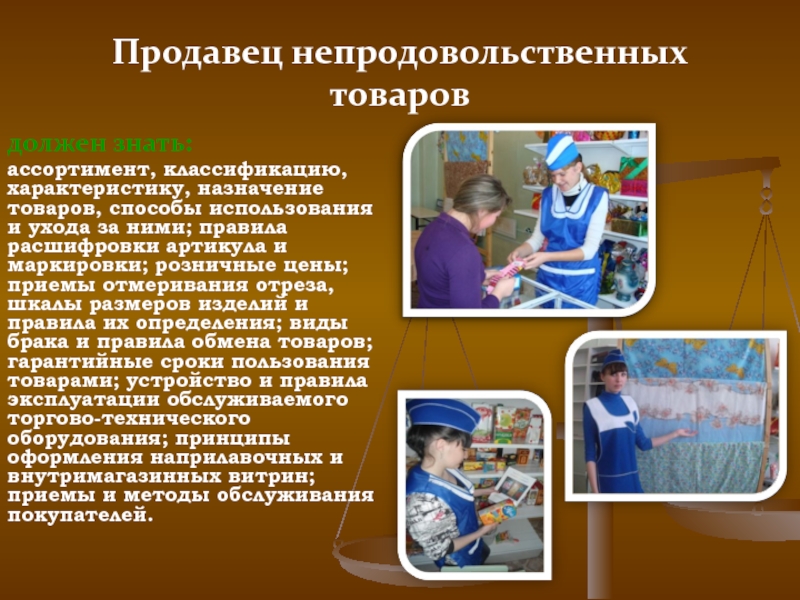 и ухода за ними; правила расшифровки артикула и маркировки; розничные цены; приемы отмеривания отреза, шкалы размеров изделий и правила их определения; виды брака и правила обмена товаров; гарантийные сроки пользования товарами; устройство и правила эксплуатации обслуживаемого торгово-технического оборудования; принципы оформления наприлавочных и внутримагазинных витрин; приемы и методы обслуживания покупателей.