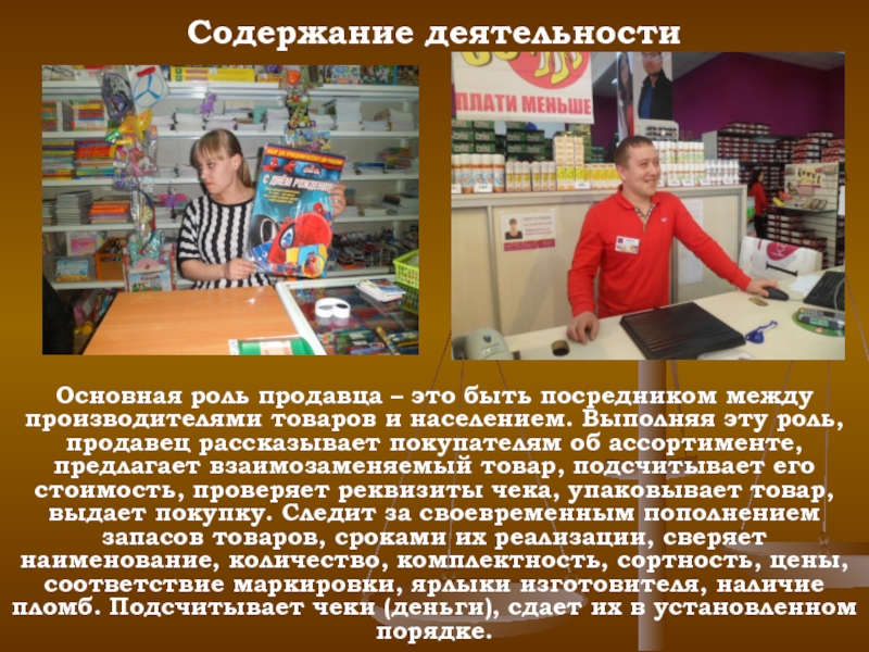 и населением. Выполняя эту роль, продавец рассказывает покупателям об ассортименте, предлагает взаимозаменяемый товар, подсчитывает его стоимость, проверяет реквизиты чека, упаковывает товар, выдает покупку. Следит за своевременным пополнением запасов товаров, сроками их реализации, сверяет наименование, количество, комплектность, сортность, цены, соответствие маркировки, ярлыки изготовителя, наличие пломб. Подсчитывает чеки (деньги), сдает их в установленном порядке.