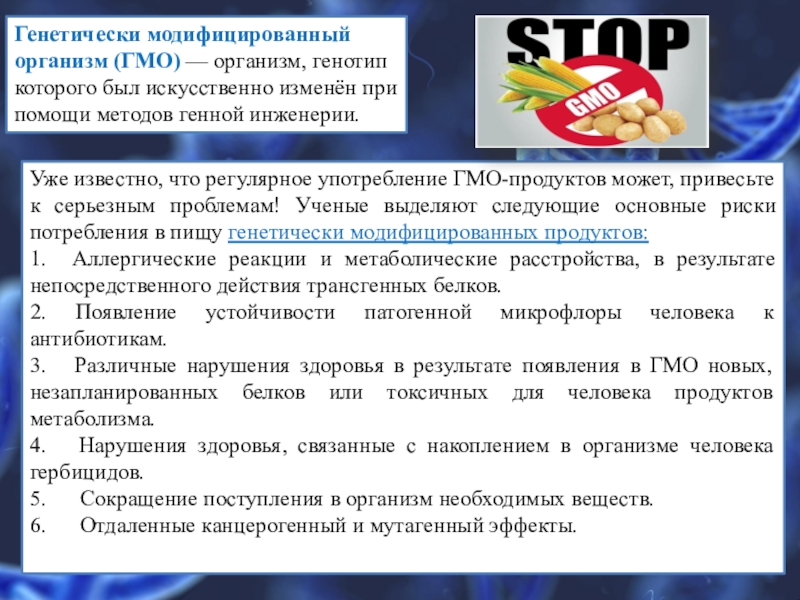 Генетически модифицированный организм (ГМО) — организм, генотип которого был искусственно изменён при помощи методов генной инженерии.