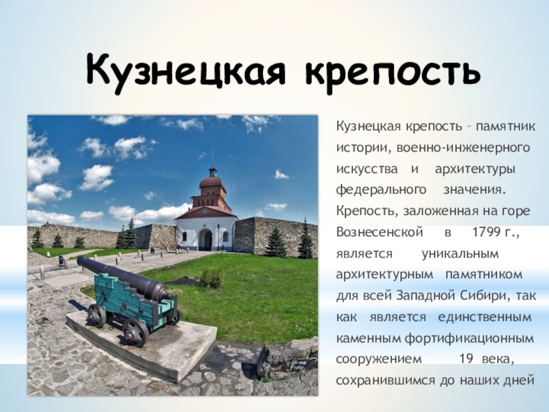 Кузнецкая крепость Кузнецкая крепость – памятник истории, военно-инженерного искусства  и  архитектуры федерального  значения. Крепость,