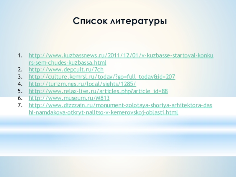 http://www.kuzbassnews.ru/2011/12/01/v-kuzbasse-startoval-konkurs-sem-chudes-kuzbassa.htmlhttp://www.depcult.ru/7chhttp://culture.kemrsl.ru/today/?go=full_today&id=207http://turizm.ngs.ru/local/sights/1285/http://www.relax-live.ru/articles.php?article_id=88http://www.museum.ru/M813http://www.dizzzain.ru/monument-zolotaya-shoriya-arhitektora-dashi-namdakova-otkryt-nalitso-v-kemerovskoj-oblasti.htmlСписок литературы