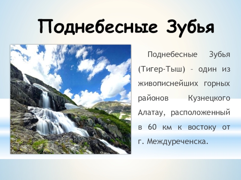 Поднебесные ЗубьяПоднебесные Зубья (Тигер-Тыш) – один из живописнейших горных районов Кузнецкого Алатау, расположенный в 60 км к