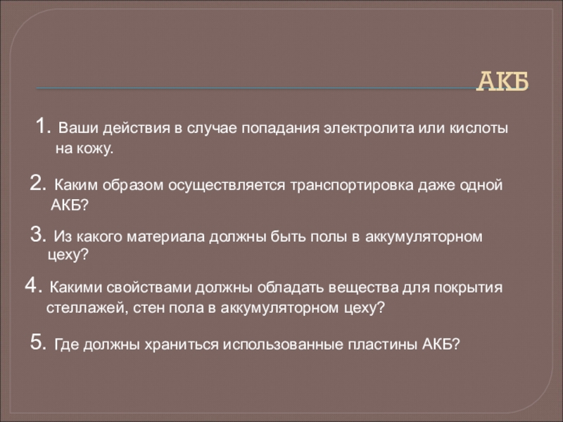 1. Ваши действия в случае попадания электролита или кислоты на кожу.