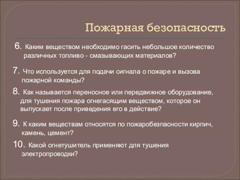 6. Каким веществом необходимо гасить небольшое количество различных топливо - смазывающих материалов?