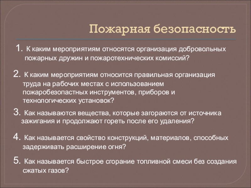 4. Как называется свойство конструкций, материалов, способных задерживать расширение огня?