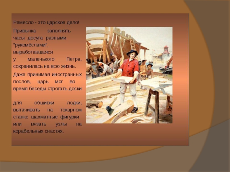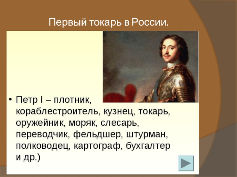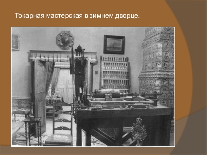 Слайд 14Петр I во время докладов имел привычку работать за токарным станком.