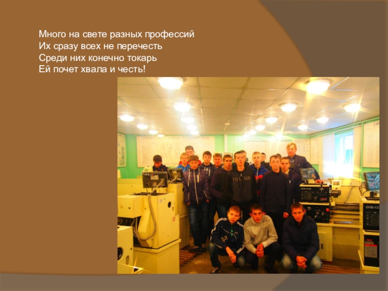 Много на свете разных профессий Их сразу всех не перечестьСреди них конечно токарьЕй почет хвала и честь!