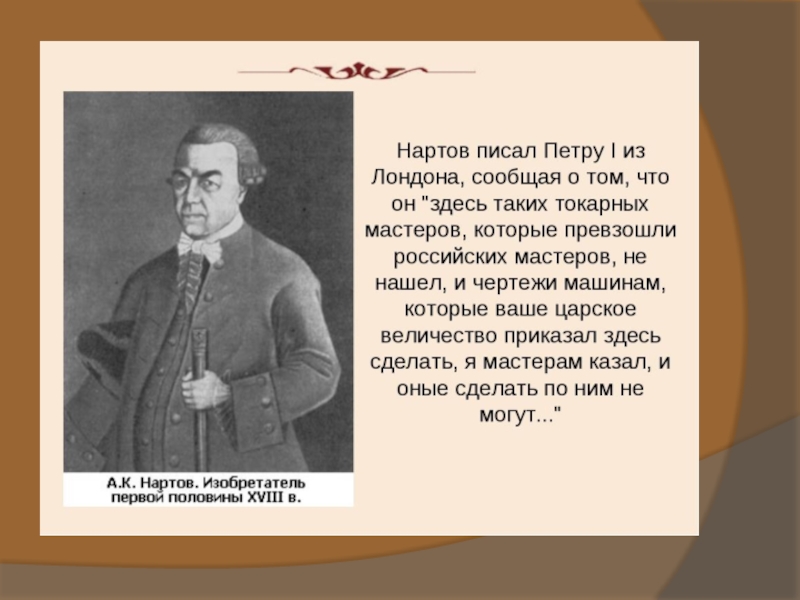 Андрей Константинович НартовСоздатель токарно-винторезного станка с механизированным суппортом и набором сменных зубчатых колёс Андрей Константинович Нартов — один