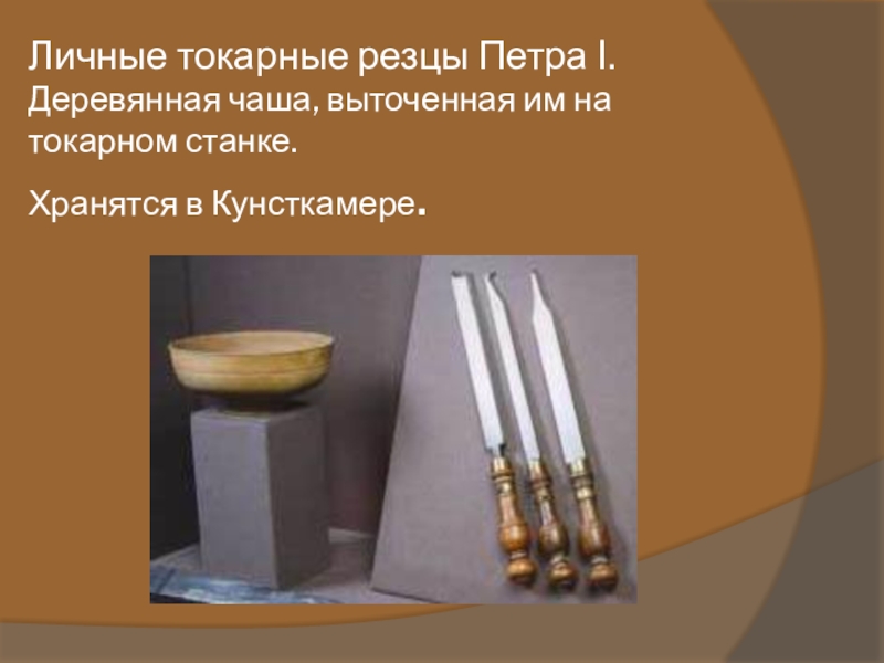 Слайд 15Личные токарные резцы Петра I.  Деревянная чаша, выточенная им на токарном станке.  Хранятся