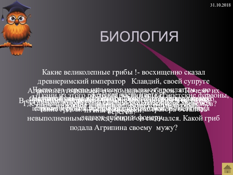 Какие великолепные грибы !- восхищенно сказал древнеримский император Клавдий, своей супруге Агрипине,угощавшей его домашним обедом. « Почему их не подавали ранее? Отныне пусть подают мне только такие грибы!» Распоряжение императора осталось невыполненным: на следующий он скончался. Какой гриб подала Агрипина своему мужу?