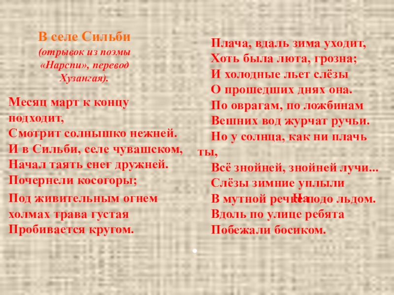 И в Сильби, селе чувашском, Начал таять снег дружней.