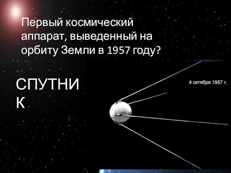 Слайд 13Первый космический аппарат, выведенный на орбиту Земли в 1957 году?