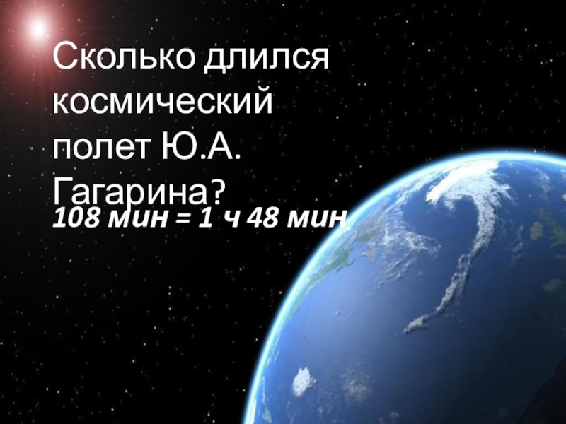 Сколько длился космический полет Ю.А. Гагарина? 108 мин = 1 ч 48 мин