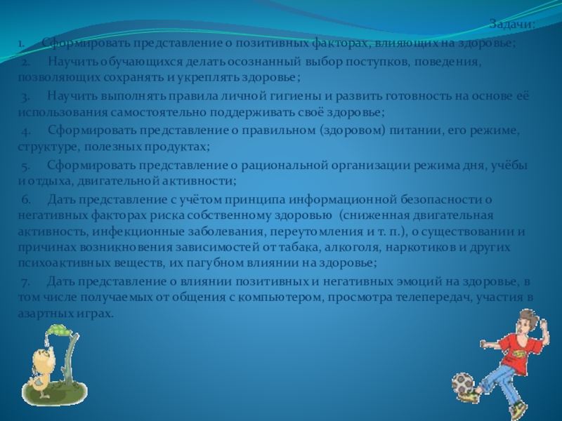 1. Сформировать представление о позитивных факторах, влияющих на здоровье;