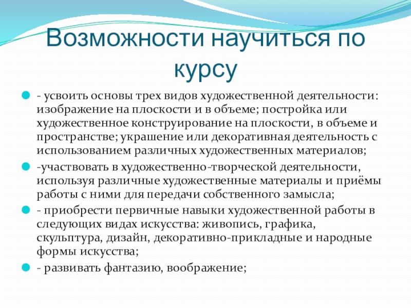 - приобрести первичные навыки художественной работы в следующих видах искусства: живопись, графика, скульптура, дизайн, декоративно-прикладные и народные формы искусства;