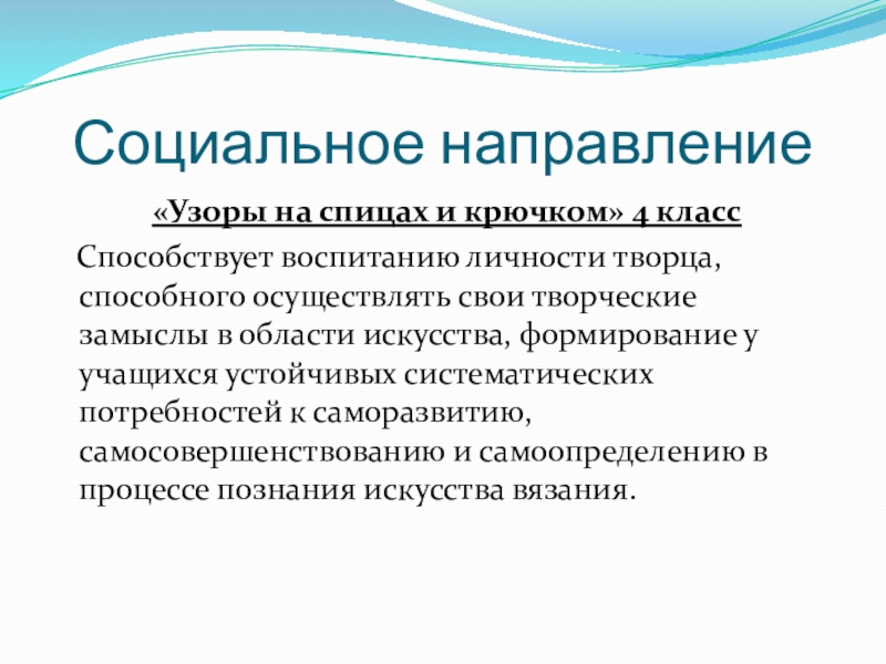 Способствует воспитанию личности творца, способного осуществлять свои творческие замыслы в области искусства, формирование у учащихся устойчивых систематических потребностей к саморазвитию, самосовершенствованию и самоопределению в процессе познания искусства вязания.