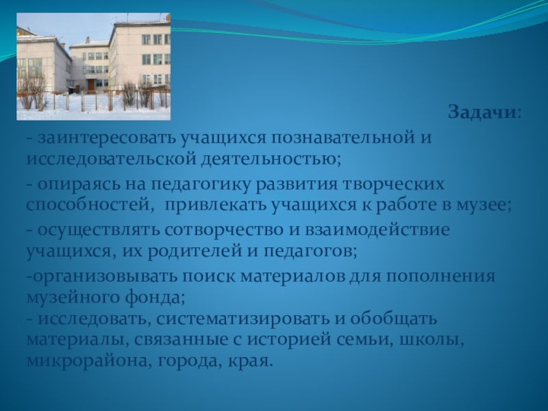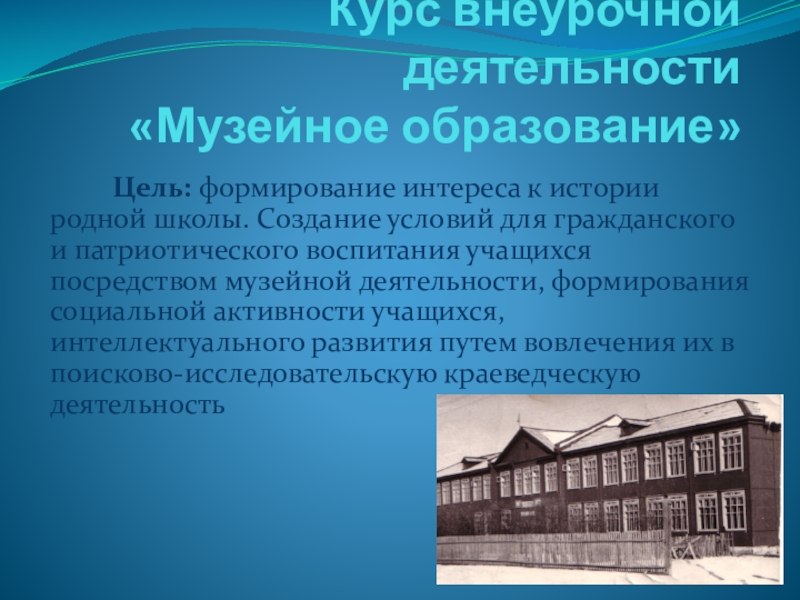к истории родной школы. Создание условий для гражданского и патриотического воспитания учащихся посредством музейной деятельности, формирования социальной активности учащихся, интеллектуального развития путем вовлечения их в поисково-исследовательскую краеведческую деятельность