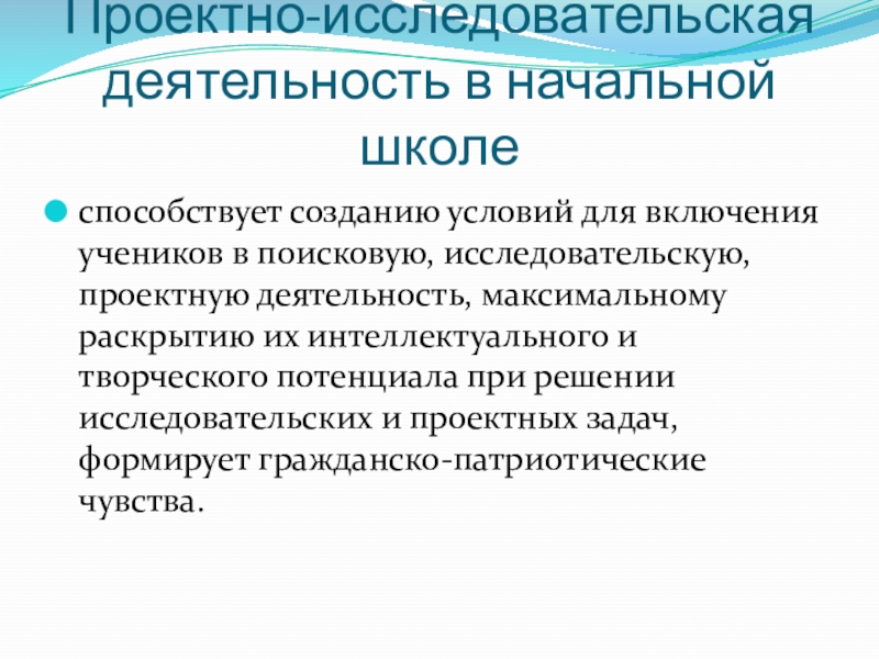 поисковую, исследовательскую, проектную деятельность, максимальному раскрытию их интеллектуального и творческого потенциала при решении исследовательских и проектных задач, формирует гражданско-патриотические чувства.
