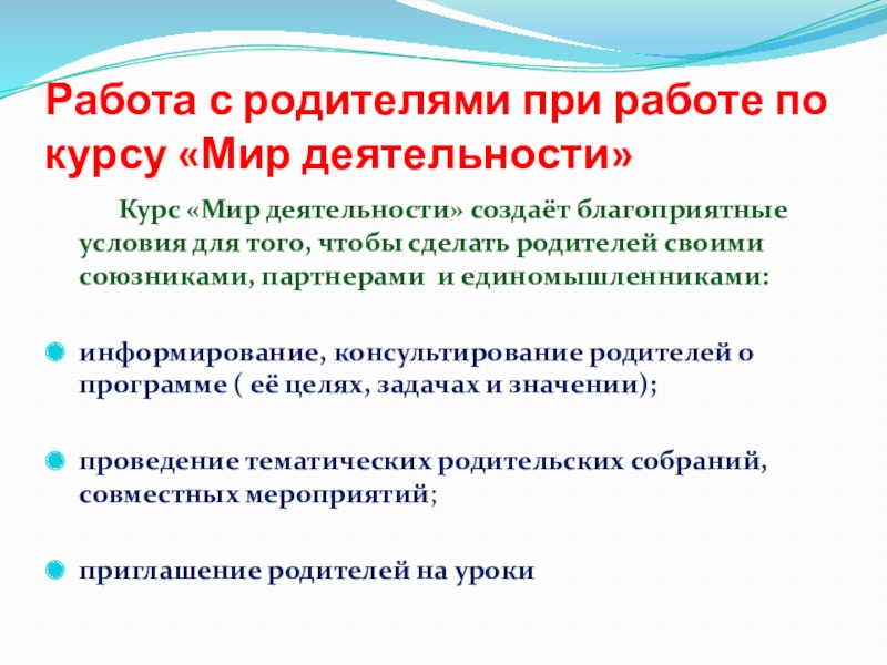 Слайд 7Работа с родителями при работе по курсу «Мир деятельности»