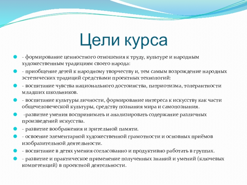 - воспитание культуры личности, формирование интереса к искусству как части общечеловеческой культуры, средству познания мира и самопознания.