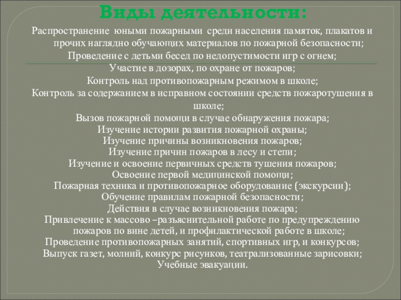 Виды деятельности:Распространение юными пожарными среди населения памяток, плакатов и прочих наглядно обучающих материалов по пожарной безопасности;Проведение с