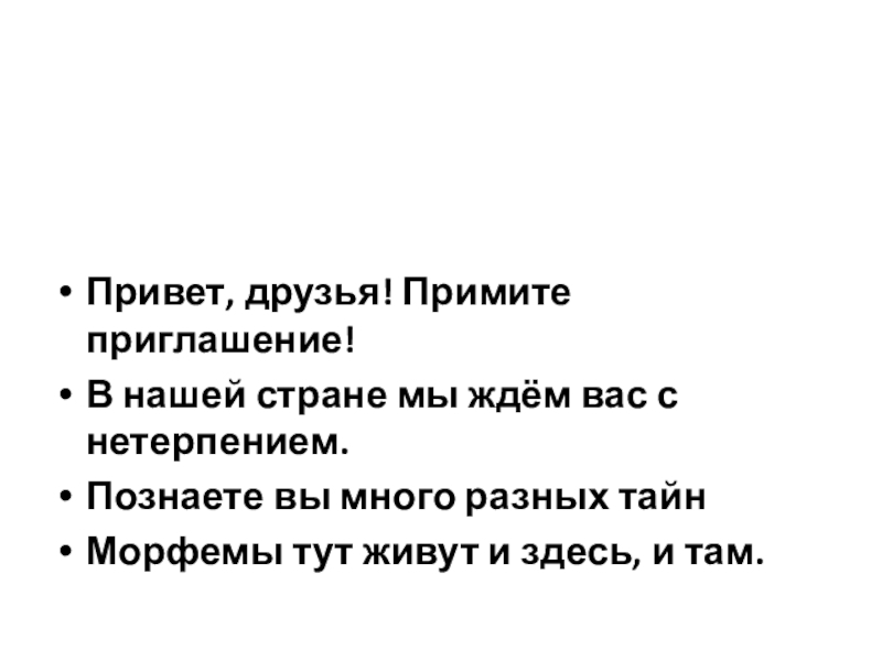 Привет, друзья! Примите приглашение!В нашей стране мы ждём вас с нетерпением.Познаете вы много разных тайнМорфемы тут живут