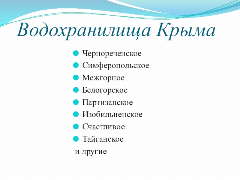 Водохранилища КрымаЧернореченскоеСимферопольскоеМежгорноеБелогорскоеПартизанскоеИзобильненскоеСчастливоеТайганскоеи другие