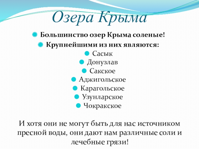 Озера КрымаБольшинство озер Крыма соленые! Крупнейшими из них являются:СасыкДонузлавСакскоеАджигольскоеКарагольскоеУзунларскоеЧокракскоеИ хотя они не могут быть для нас источником
