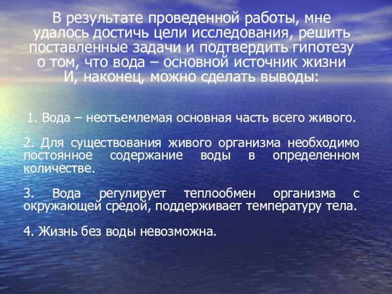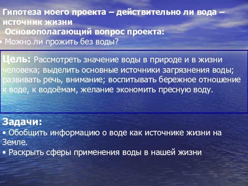 задачи и подтвердить гипотезу о том, что вода – основной источник жизни