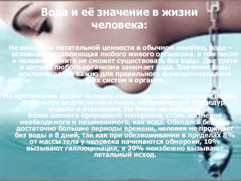 Слайд 5Если без пищи человек может прожить достаточно долго, то без воды