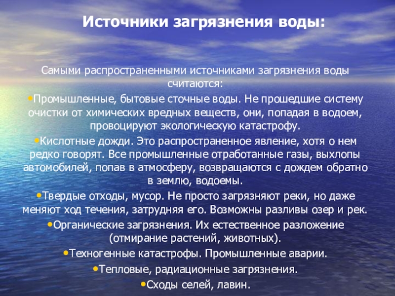 основные источники загрязнения воды; развивать речь, внимание; воспитывать бережное отношение к воде, к водоёмам, желание экономить пресную воду.